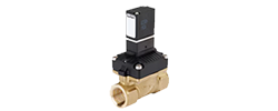 2/2-way solenoid valve with servo-diaphragm and 3-way pilot control with medium separation.Available in the circuit functions NC and NO. The medium separation in the pilot valve enables the valve to be used for a slightly aggressive medium. (e. g. deionized water).