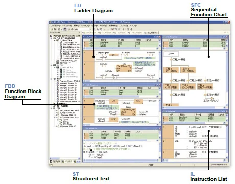 High-level (structured text) languages that allow structuring, such as C, are supported. 5 programming languages: IL (Instruction List), LD (Ladder Diagram), FBD (Function Block Diagram), SFC (Sequential Function Chart ), ST (Structured Text)