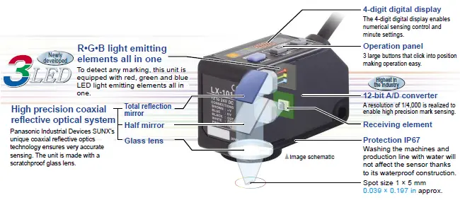 Coaxial reflective optics and a sharp 1 x 5 mm 0.039 x 0.197 in spot enable high precision sensing. Stable detection of marks is possible.