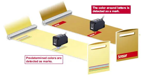 All 3 R・G・B LEDs light up and high precision mark color discrimination occurs using the R・G・B reflective light ratio. This function enables effective detection of films with patterns around the area of the mark.