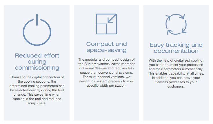 The intelligent cooling media cabinets from Bürkert make a significant contribution to designing and implementing efficient cooling concepts in the foundry. On the PC, the individual cooling parameters can be set, continuously monitored and documented so that any errors can be immediately identified and corrected. At the same time, the cooling is always precisely matched to the respective component so that cycle times can be shortened.