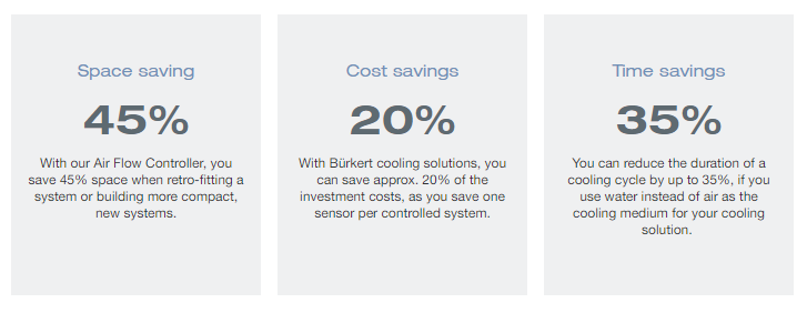 Burkert offers compact cooling solutions in the control cabinet either as air cooling, water cooling, or combined air/water cooling.