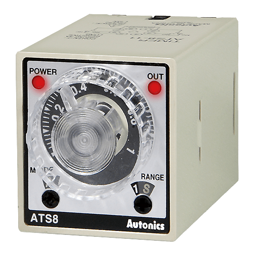 The ATS series compact multi-function analog timers feature 6 output operation modes and 12 time setting ranges for application in diverse timing control tasks. The timers also feature a wide time setting range between 0.1 seconds to 30 hours depending on the model. Simple time configuration and operation is possible with the analog dial control. The ATS series is available in 8-pin or 11-pin plug models.