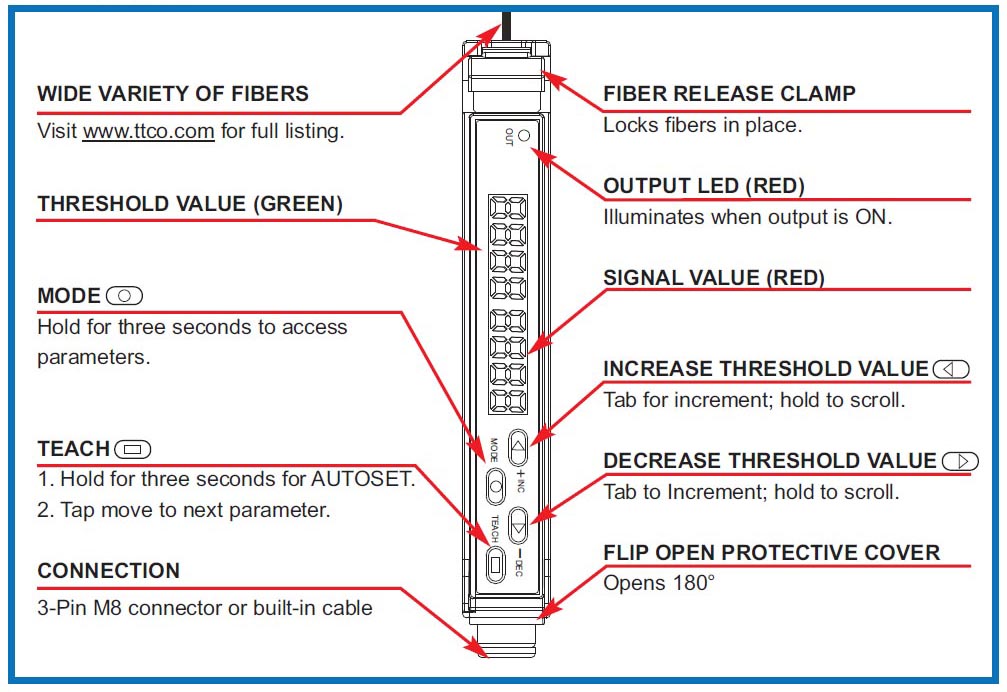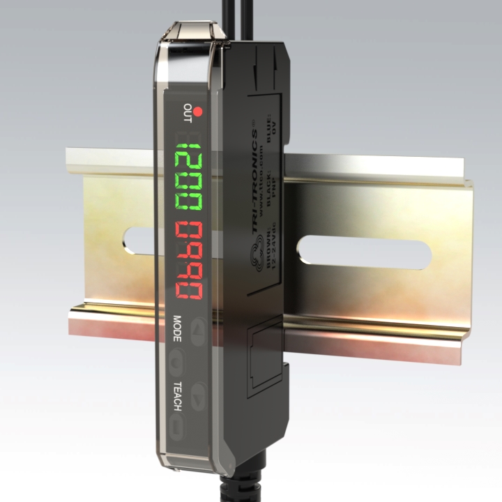 The Plastic Fiber Sensor answers the need for a more affordable sensor suitable for most applications. The PFS will easily replace most general-purpose plastic fiberoptic amplifiers without sacrificing key features. This sensor still features our signature fast setup method with a one-button setup to teach the sensor and set the threshold. It has a dual 4-digit display, one in green and one in red, to display the threshold and returned light level. Two buttons for manual threshold adjustment, diffuse or through beam selection, four response times settings, and up to 5000ms of output, and delay are included. The slim line 10mm wide housing with a protective lid will fit in a variety of small spaces.