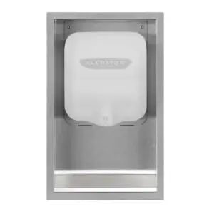 Xlerator® Recess Kit, 16-3/8” W x 26”H x 3-3/8”D, for all hand dryers, designed to recess any Xlerator® high-efficiency hand dryer, meets ADA protrusion requirement of 4″ (102 mm), welded construction, 22-gauge wall box, 16-gauge mounting plate, type 304 18/8 stainless steel with #4 satin finish, 1-year warranty, Made in USA