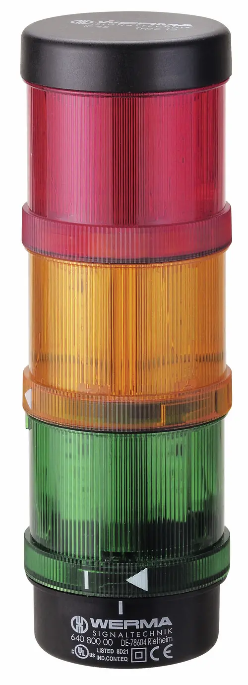 WERMA LED STACKLIGHT: RED (PERM) + YEL (PERM) + GREEN (PERM) + AUDIBLE (100 DB); SURFACE MOUNT W/TUBE; 24 V; 70 MM DIAM. Availability: if your order is urgent, or you need to know the current lead time for this product, please contact us for details. Ask about possible expedite options.