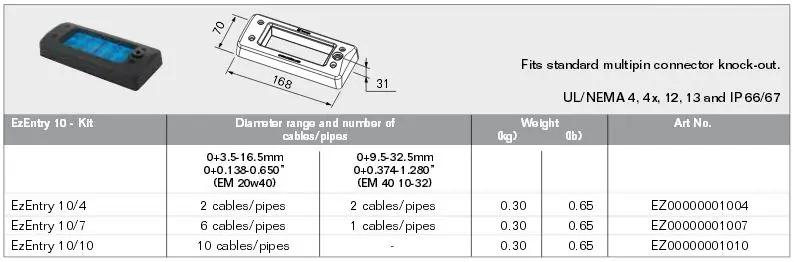 EZEntry10/10 Roxtec rectangular cable seal, accommodates up to 10 cables/pipes; 10 cables with a diameter range from 0.138 to 0.650″.Standard multi-pin 24 knock-out. Kit includes lubricant, screws, and hex keys.