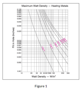 The graph in Fig 1. (above) shows the effect of fit in determining the maximum recommended watt density on a steel platen. As it is indicated in the graph, the tighter the fit, the higher the maximum recommended watt density.