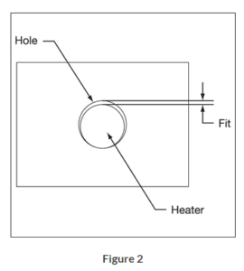 When heating a platen, mold, die or hot runner probe with Hi-Density Cartridge Heaters inserted into drilled holes, fit is an important factor in determining the life expectancy of the heater. Fit is the difference between the minimum diameter of the cartridge heater and the maximum diameter of the hole. Unheated sections on a Hi-Density cartridge may be smaller in diameter due to swaging. To determine fit, use the smallest diameter on the heated length only.