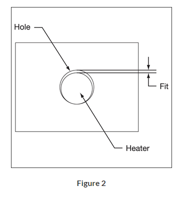 When heating a platen, mold, die or hot runner probe with Hi-Density Cartridge Heaters inserted into drilled holes, fit is an important factor in determining the life expectancy of the heater. Fit is the difference between the minimum diameter of the cartridge heater and the maximum diameter of the hole. Unheated sections on a Hi-Density cartridge may be smaller in diameter due to swaging. To determine fit, use the smallest diameter on the heated length only.
