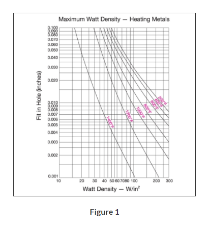The graph in Fig 1. (above) shows the effect of fit in determining the maximum recommended watt density on a steel platen. As it is indicated in the graph, the tighter the fit, the higher the maximum recommended watt density.